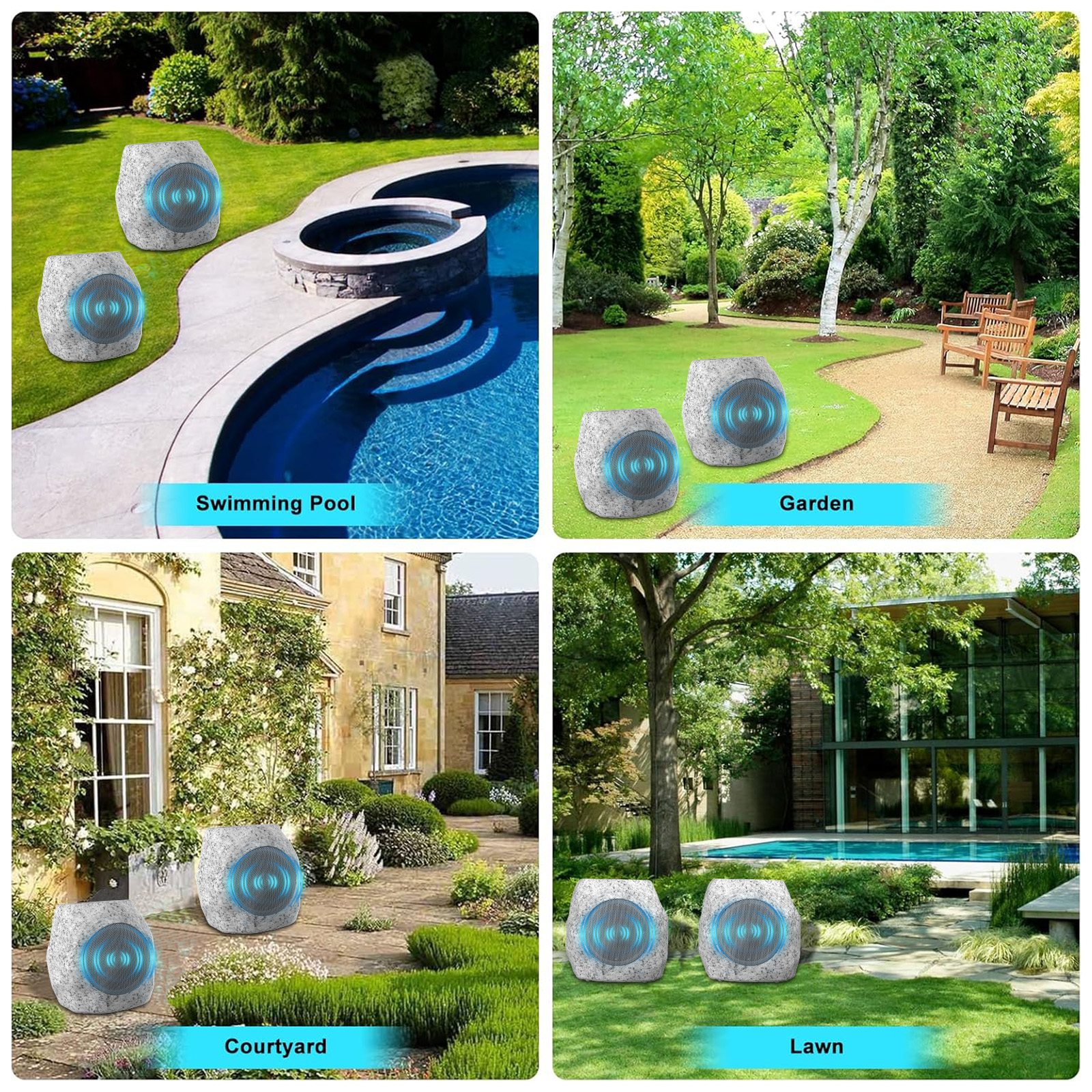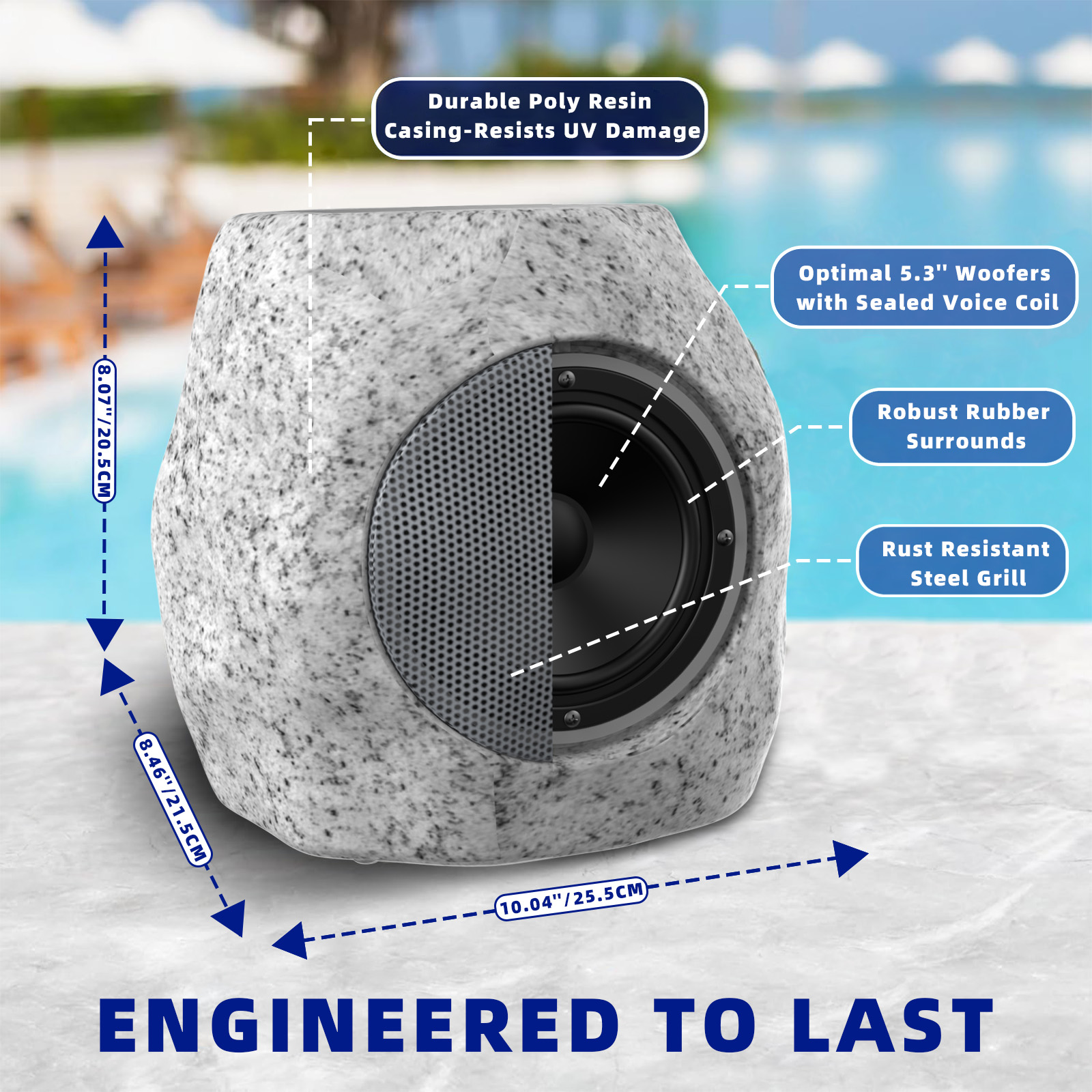 Outdoor Speakers Bluetooth Waterproof: This outdoor bluetooth speakers features a standard IP44 Waterproof design. The rock solid exterior of the speaker can withstand all weather conditions. You can put them in the rain, snow or harsh sunlight, and it will work fine. At the same time outdoor rock speakers faux rock design can blend perfectly with your garden, patio or backyard while providing you with beautiful, lively music!